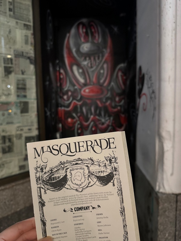 평일 저녁 7시 무렵, 카네기 홀 근처의 한 건물 앞. 턱시도와 드레스를 차려입고 각양각색의 가면을 쓴 이들이 줄지어 서 있다. 그중에는 흡사 <오페라의 유령>의 팬텀처럼 긴 망토를 두른 사람들도 눈에 띈다. 관객들은 7시 공연과 그 다음 그룹인 7시 15분 공연을 위한 줄로 나뉘어 서고, 휴대폰 카메라를 가릴 스티커를 받는다. 스티커에는 <오페라의 유령>의 넘버 ‘Masquerade’의 가사 한 줄, “Let the spectacle astound you.”라는 문구가 적혀 있다. 입장 방식은 조금 색다르다. 티켓 구매자의 이름과 관람 하루 전 이메일로 받은 비밀번호를 말하면, 스태프가 손등에 팬텀의 가면 모양 도장을 찍어준다. 본인이 직접 챙겨온 가면이 없는 관객은 입장 직전에 팬텀의 가면이 수놓아진 마스크를 받게 된다. 모든 관객은 코트와 가방을 보관소에 맡기고, 흰색 가면을 쓴 스태프의 안내에 따라 입장한다. 이동 중 도움이 필요하면 흰 마스크를 쓴 이들을 찾으라는 안내와 함께, <마스커레이드>로의 여정이 시작된다. <마스커레이드>의 경험은 단순히 두 시간의 공연에 그치지 않는다. 티켓을 구매하고, 비밀번호를 전달받고, 어떤 의상을 입고 어떤 가면을 쓸지 고민하는 순간부터 이미 공연은 시작된다. 관객은 극장을 찾기 전부터 참여자로서 이 세계에 발을 들여놓는 셈이다.