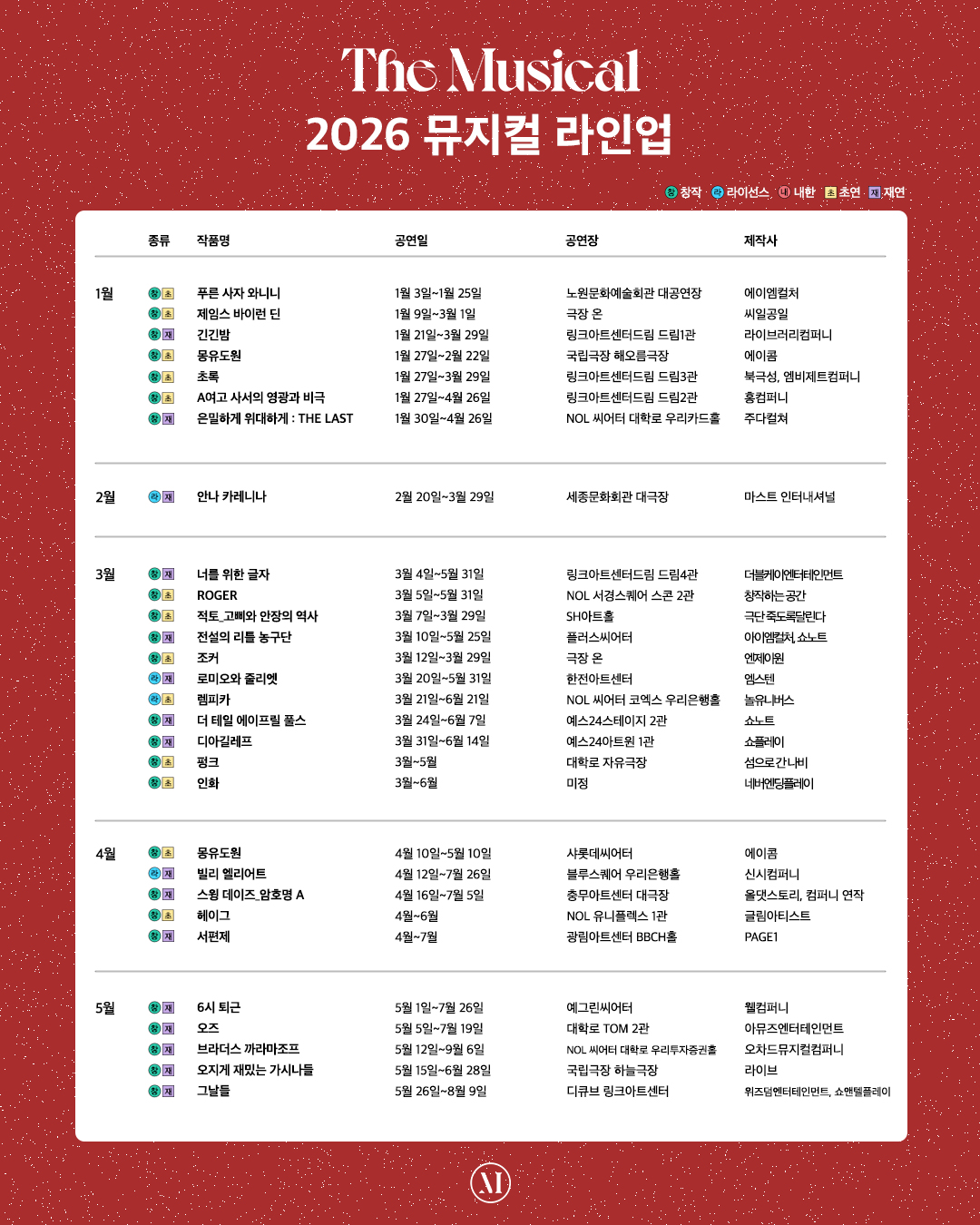 한국문화예술위원회의 대표 지원사업 ‘공연예술창작산실 올해의신작’ 선정작 일곱 작품이 2026년의 시작을 장식한다. 실존 인물과 문학 고전, 청소년 서사를 바탕으로 청춘이 마주한 선택과 저항의 순간을 그리고, 개인의 성장과 연대를 통해 시대를 비추는 작품들이다. <푸른 사자 와니니> <제임스 바이런 딘> <초록> < A여고 사서의 영광과 비극 > < ROGER > <적토_고삐와 안장의 역사> <조커>가 1월부터 3월까지, 순차적으로 개막한다. 루리 작가의 동명 도서를 원작으로 하는 <긴긴밤>이 재연으로 돌아오고, 동명 웹툰을 원작으로 하는 <은밀하게 위대하게 : THE LAST>는 10주년 기념 공연으로 돌아온다. 최인호 작가의 소설 『몽유도원도』를 원작으로 하는 <몽유도원>은 삼국사기 속 ‘도미전’ 설화를 모티프로, 도미와 아랑, 여경의 이야기를 통해 인생의 의미를 그리는 작품이다. 여경(개로왕) 역에 민우혁, 김주택, 아랑 역에 하윤주, 유리아, 도미 역에 이충주, 김성식이 캐스팅됐다. 2월에는 <안나 카레니나>가 약 7년 만에 다시 돌아온다.