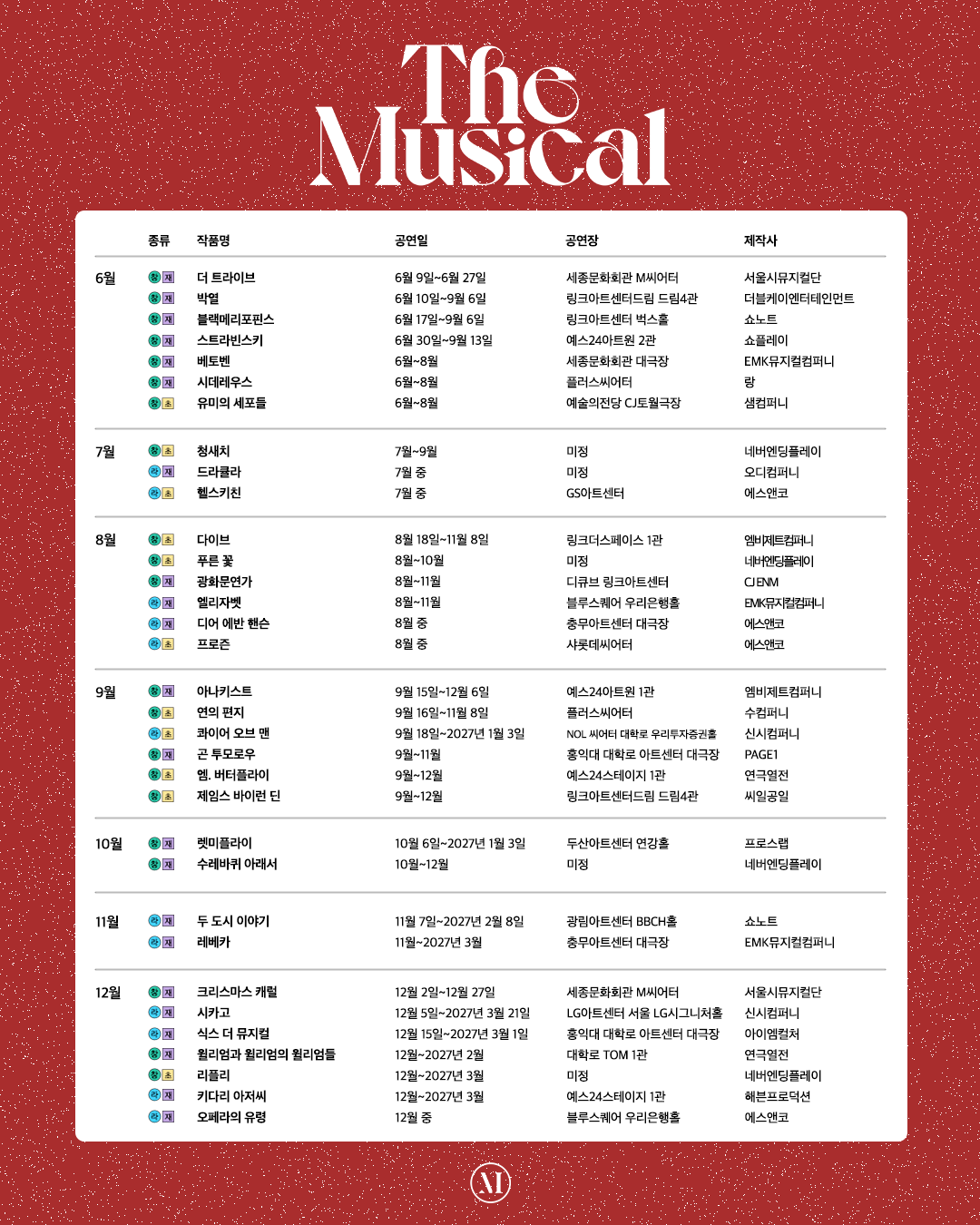 1966년, 한국 창작 뮤지컬의 효시로 일컬어지는 예그린악단의 <살짜기 옵서예>가 탄생했다. 한국 뮤지컬의 역사가 60주년을 맞이하는 2026년에는 또 어떤 작품들이 관객을 만날 준비를 하고 있을까? 더뮤지컬이 준비한 2026 뮤지컬 라인업&주목할 만한 연극 리스트.