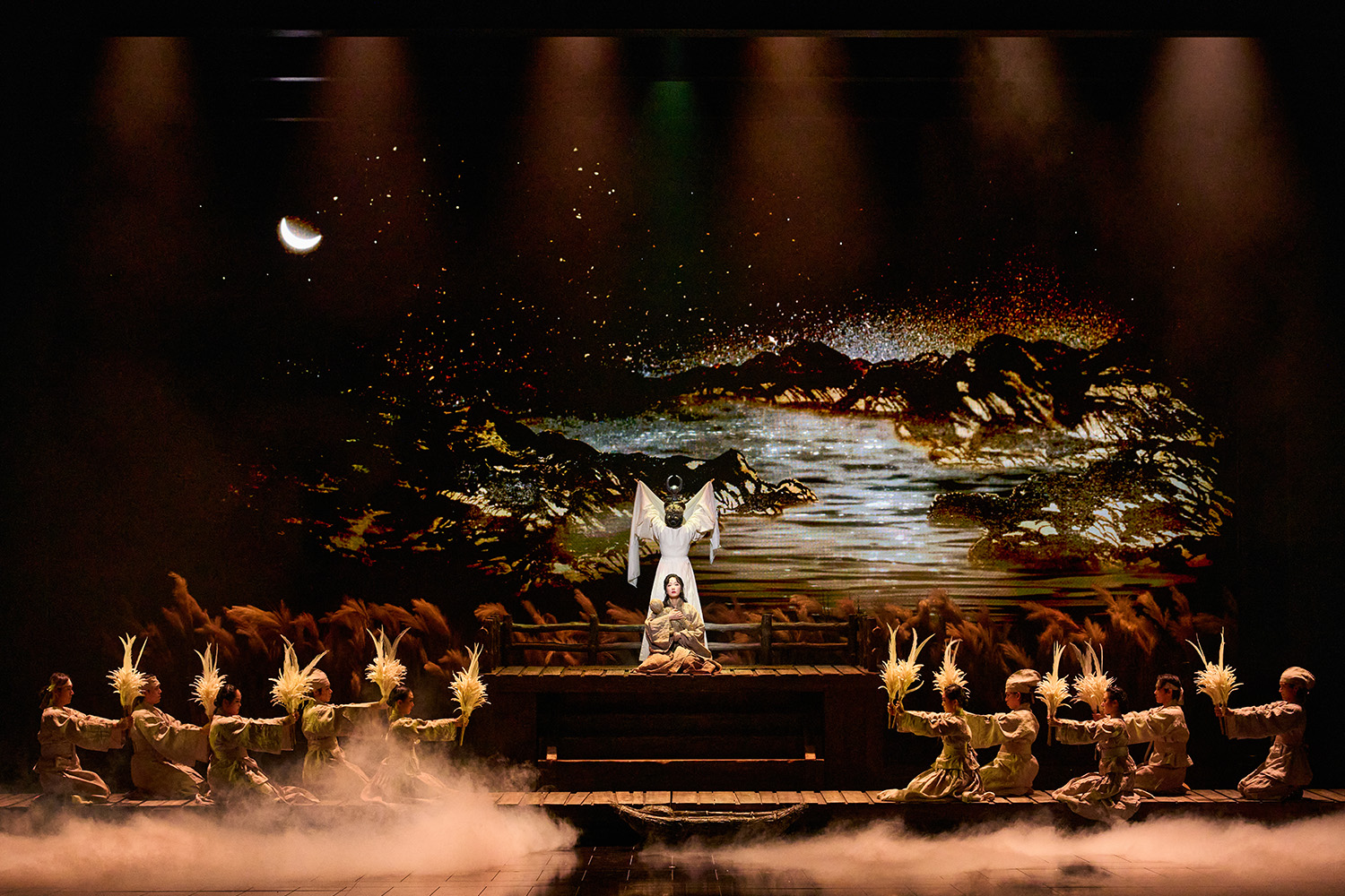 아랑에게 도미와의 사랑은 단순한 이성 간의 애정을 넘어선다. 그것은 인간으로서의 도리이자 ‘말의 무게’를 끝까지 감당하는 책임의 실천이다. “세월 지나 이 모습 변한다 해도 세상 끝까지 그대만을 사랑합니다”(‘도원의 혼례’), “이 세상을 다 헤매도 그대를 찾으리”(‘그리고 그리며’)와 같은 서약은 아랑의 단단한 행동력을 통해 실재하는 진실이 된다. 이러한 신념은 아랑이 스스로 얼굴에 상처를 내는 결단에서 절정에 달한다. 이는 자신의 외모가 비극의 원흉이라는 자책이 아니라, 소리와 향기만으로도 자신을 찾아낼 도미에 대한 확고한 신뢰가 바탕이 되었기에 가능한 선택이다. 아랑은 스스로 선택한 비극으로 사랑의 본질과 진정한 자유를 질문한다. 자신을 해함으로써 오히려 자아를 지켜내는 이 결단은 사랑마저 가벼워진 시대에 비현실적으로 보인다. 그러나 <몽유도원>은 아랑의 선택과 실천을 통해 사랑의 숭고한 형태와 방식을 증명하며, 객석의 관객을 끝내 설득해낸다.