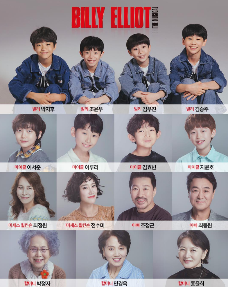 2026 뮤지컬 <빌리 엘리어트>의 여정은 ‘빌리’ 찾기에서 시작됐다. 지난 2024년 9월에 열린 1차 오디션을 시작으로 약 1년 동안 3차에 걸친 오디션과 안무 기본기를 훈련시키는 ‘빌리 스쿨’이 진행되었다. 그 치열한 과정을 통해 마침내 뮤지컬 <마틸다>, <레미제라블>, <프랑켄슈타인> 등 이미 다수의 뮤지컬 경력을 가진 김승주(13), 특기인 힙합 댄스뿐만 아니라 다양한 춤을 섭렵하고 있는 박지후(12), 4살부터 발레 학원을 다니며 빌리를 꿈꿨던 김우진(11), 영화, 드라마, 광고 등 다양한 장르에 이어 뮤지컬까지 도전하는 조윤우(10)가 ‘빌리 엘리어트’ 역으로 최종 선발되었다.